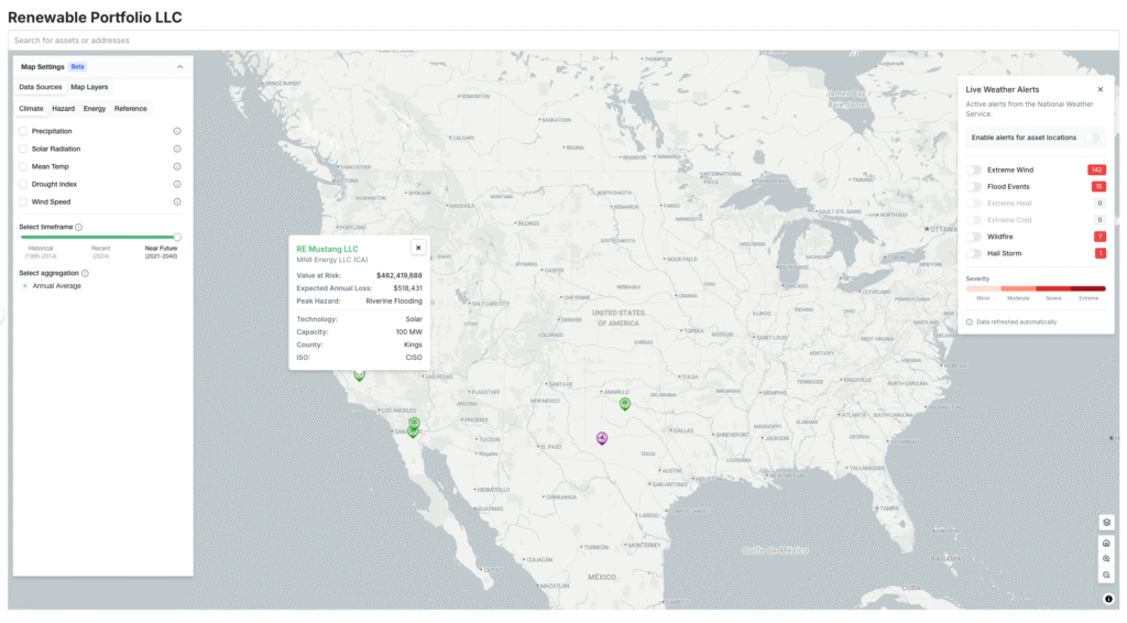 Interactive map for full asset visibility. Track sites, transmission lines, and hazards in real time, with live weather alerts and natural-language AI queries to explore risk and exposure across your portfolio.